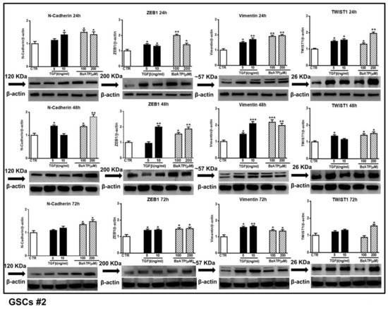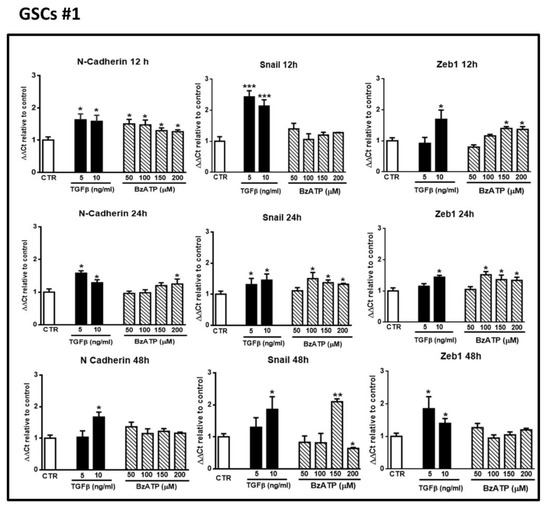Based on these findings, we better investigated the effect of the activation of these receptors on the same EMT markers. Indeed, their expression increased from 12–24 up to 48–72 h following GSCs exposure to the P2X7R agonist, BzATP, as well as to TGFβ1, a well-known inducer of EMT in GBM [7,36]. However, mRNA analysis of the EMT markers showed some differences among the examined cells, which probably correlates with a different cell efficiency/rate of DNA transcription into mRNA in response to pharmacological stimulation. In contrast, the mRNA translation into the corresponding proteins resulted in a more constant response of the cells to the investigated drugs (TGFβ1 and BzATP). Thus, our data confirm the need to look also to the proteins codified by the corresponding mRNAs, which may more reliably account for drug effects.