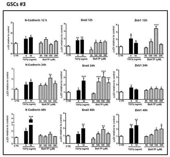 Effect of TGFβ1 or BzATP on EMT markers evaluated by qRT-PCR at different times after drug administration to cultured GSCs #3. Similar to what is reported in the legend of the Figure 2, confluent GSCs were exposed to TGFβ1 or BzATP for the indicated times, at the end of which cells were collected and their mRNA was analyzed for the gene expression of EMT markers. mRNA levels were normalized (ΔCt) by using the house keeping GAPDH as endogenous control and the results were analyzed for relative quantitation among groups using the comparative 2 ΔΔCt method. Values, calculated as fold of increase vs. untreated cells assumed as control (CTR) are the mean ± S.E.M. of three independent experiments in which each sample was tested in duplicate. *p < 0.05, **p < 0.01, ***p < 0.001: statistical significance vs. CTR (one-way ANOVA plus Dunnett’s test).