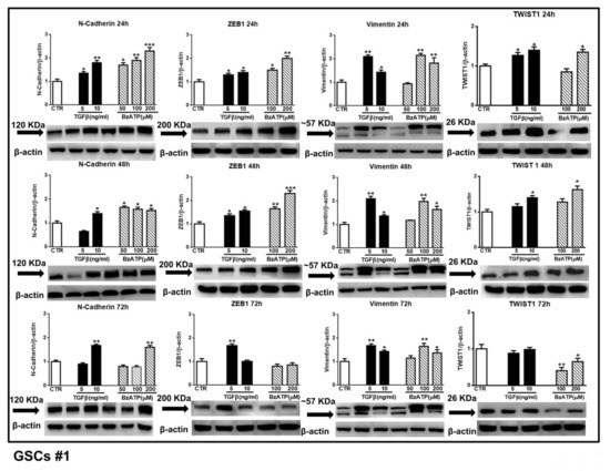 These findings were corroborated by those obtained performing western blot analysis to evaluate N-cadherin, ZEB1, vimentin and Twist1 expression at different time periods. As shown in the Figure 4 and Figure 5, related to GSCs #1 and #2, both pharmacological agents were effective. In particular, in GSCs #1, BzATP caused a greater effect on N-cadherin and ZEB1 at 24 and 48 h after drug administration, thus reflecting the timeline of events observed by mRNA analysis. Moreover, the increase of vimentin was evident up to 72 h following cell exposure to TGFβ1 or BzATP whereas that of Twist was limited to the first 24 h. GSCs #2, like GSCs #3 (see data from real time PCR in Figure 3), showed a high responsiveness to BzATP, being the protein content of all EMT markers under investigation significantly increased throughout the 72 h observation period.