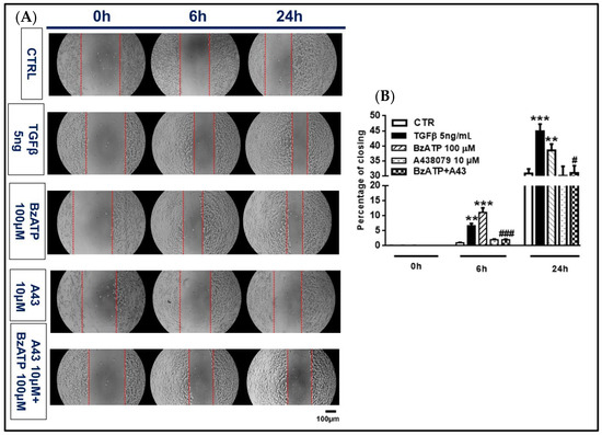 Effect of TGFβ1 and BzATP on GSC migration evaluated by scratch assay. Nearly confluent GSCs (80%) were incubated in the presence or absence of TGFβ1 or BzATP and when present, the P2X7R antagonist A438079 (A43), was added 1 h prior to the agonist. Cell were then scratch wounded and imaged at indicated times after injury. (A) Images of control and treated cells (GSCs #1) prior to (0 h) and 6 and 24 h after injury are representative of four independent experiments (scale bar = 100 μm for all panels) carried out for each cell type, giving similar results. (B) Quantification of the wound size was performed using ImageJ and graphed as percentage of wound closure. The values in the histograms are given as means± SEM and analyzed by one-way ANOVA and Dunnett’s post hoc test **p < 0.01; ***p < 0.001 vs. control (CTR); #p < 0.05, ###p < 0.001 vs. BzATP. Similar data were obtained using GSCs #2 and #3.