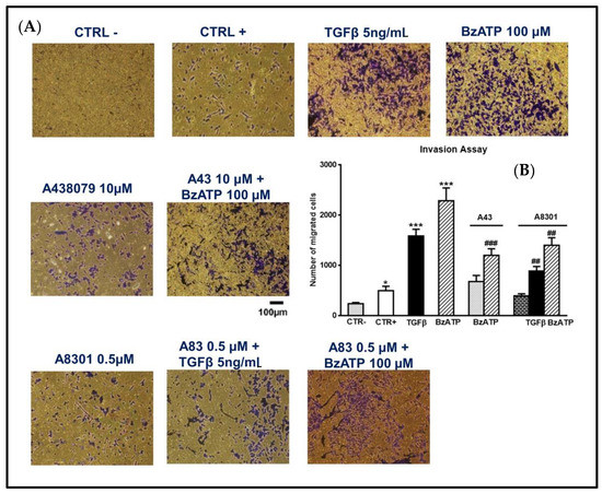 Effect of TGFβ1 and BzATP on GSC invasiveness evaluated by transwell migration assay. (A) GSCs, plated in the upper surface of a membrane inserted into a suitable plate, were incubated in the usual culture medium alone (CTR-) or in the presence of TGFβ1 or BzATP. In some experiments cells were pretreated with A438079 (A43), a P2X7R antagonist, or A8301 (A83), inhibitor of TGFβ type I receptors, which were added alone and 1 or 2 h, respectively, prior to the further pharmacological treatments. In another set of cells, a high percentage of serum (10%), usually acting as an attractant for cells, was added to the medium and cells were indicated as CTR+. The cells were allowed to migrate to the lower chamber for 24 h. The membranes were then removed and the cells, fixed and stained using crystal violet, were counted under a light microscope (at an average of five semirandom non-overlapping fields at 10x magnification). The images reported in the figure (scale bar = 100 μm) are related to GSCs #2 and are representative of three independent experiments carried out for each cell type, giving similar results. (B) Accordingly, values in the histograms are the mean ± SEM of these independent experiments and have been analyzed by one-way ANOVA and Dunnett’s post hoc test *p < 0.05, ***p < 0.001 vs. control (CTR+); ##p < 0.01; ###p < 0.001 vs. cells treated with TGFβ1 or BzATP.