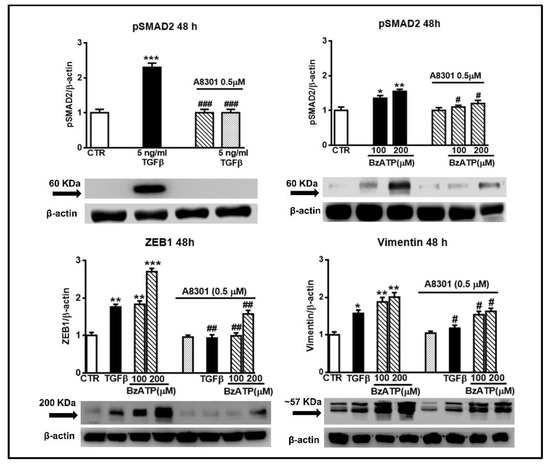 As reported in glioma cell lines, TGFβ is an inducer of ZEB1-dependent mesenchymal trans-differentiation coupled to enhancement of their invasion capability. Interestingly, this effect was mediated by phosphorylation of SMAD2 [36], a protein involved in direct signaling of TGFβ type I receptors [37]. Since in our GSCs derived from patients’ tumor TGFβ had a behavior similar to that shown in GBM cell lines, i.e., as for ZEB1 and invasion increase, we wondered whether the effects caused by TGFβ and also by BzATP in our GSCs could be mediated by the same signal transduction pathway. Figure 9 shows that not only TGFβ but also BzATP, although to a lesser extent, increased SMAD2 phosphorylation. These effects were evident already after 24 h (data not shown), becoming maximal at 48 h. Accordingly, cell pretreatment with A8301, a potent blocker of the TGFβ type I receptors [36] was effective in inhibiting the TGFβ- and BzATP-induced increase in SMAD2 phosphorylation as well as the activity of both drugs on ZEB1 and vimentin expression (Figure 9) and GSC invasiveness (Figure 8).