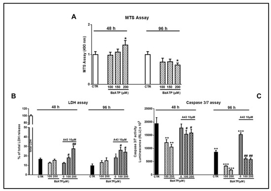Finally, by MTS assay we found that cell exposure to BzATP at the chosen concentrations did not affect cell viability after 48 h, while modestly reducing it at 96 h, but only when used at 200 μM (Figure 10A). However, the evaluation of LDH and caspase 3/7 activity in the GSC culture medium, assumed as signals of necrotic and apoptotic death, respectively, showed that BzATP reduced the activity of the caspases without influencing that of LDH (Figure 10B,C). The effect of BzATP was once again counteracted by cell pre-treatment with the P2X7R antagonist that, when administered alone, increased LDH and caspases activity 96 h after its addition to the cells.