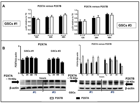 Based on the evidence previously reported about the high expression levels of P2X7R in GSCs [24], we wanted to better define the role played by this receptor in GSCs by examining the expression of the P2X7AR and P2X7BR splice variants, which could influence GSC aggressiveness in different ways. By real time PCR and western blot analysis, we observed that both P2X7R isoforms are present in GSCs (Figure 11) and that the expression of the subunits of the full length P2X7AR and of the shorter P2X7BR was nearly constant during 48 h (Figure 11A). Similar results were obtained by western blot analysis (Figure 11B).