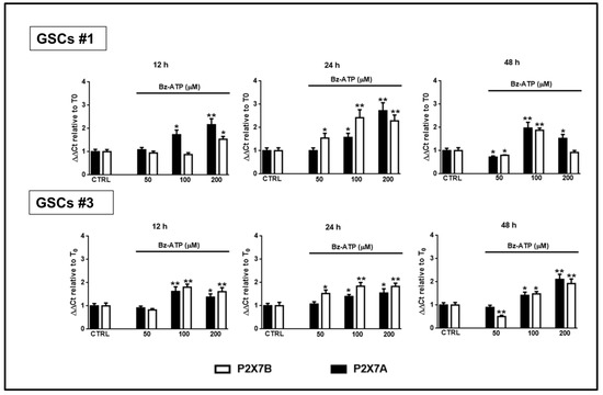 Interestingly, cell exposure to BzATP induced an increased expression of mRNA for both splice variants, despite some differences. In GSCs #1, the expression of both isoforms was significantly increased even though that of the splice variant P2X7B was mainly evident at 24 h from drug treatment (Figure 12).