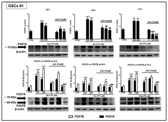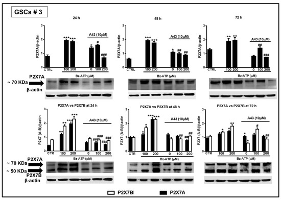 In GSCs #3, the BzATP-induced up-regulation was similar for both P2X7R subunits along the entire observation period. However, these differences were nullified when the expression of the two splice variants was evaluated in terms of protein content. Indeed, BzATP showed a similar effect in GSCs #1 and # 3 up to 72 h (Figure 13 and Figure 14).