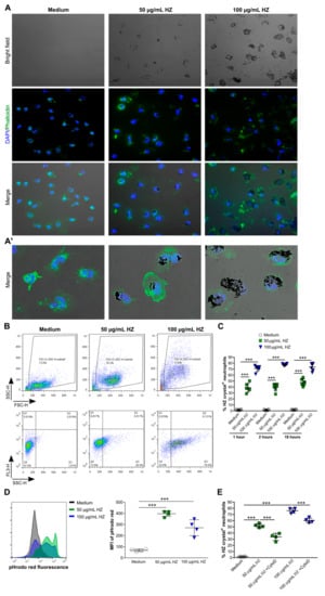 To investigate the capacity of neutrophils to internalize HZ, we cultured human blood neutrophils in the presence or absence of HZ crystals in RPMI medium for 2 h, and performed fluorescence microscopy using the actin stain phalloidin (green) and the nuclear marker DAPI (blue). As illustrated in Figure 1A,A’, the uptake of HZ resulted in morphological changes in neutrophils, in particular in size/shape, as indicated by phalloidin, and in deformed nuclei/granules, as indicated by DAPI. Flow cytometry analysis revealed that neutrophils increased in size and granularity following uptake of HZ, as shown by an increase in side scatter (SSC) (Figure 1B). The percentage of HZ crystal+ neutrophils increased in a dose-dependent manner but independent of the exposure time (Figure 1C).