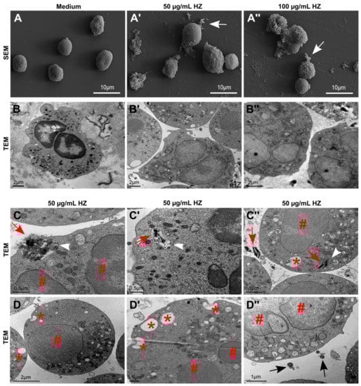 To characterize the internalization process of HZ and the morphological abnormalities in more detail, we performed SEM and transmission electron microscopy (TEM) of human neutrophils in the presence or absence of HZ. Untreated neutrophils appeared round in shape with an even surface (Figure 2A, medium). After intracellular uptake of HZ, neutrophils increased in size and became activated, as illustrated by their rough membrane surface (Figure 2A’,A”). Neutrophils were also surrounded by clusters/aggregates of HZ crystals (white arrows) (Figure 2A’,A”). Under normal conditions (medium), neutrophils showed numerous dense granules and lysosomes in the cytoplasm (Figure 2B). The multi-lobed nucleus with the highly condensed heterochromatin (dark) was neatly marginalized to the edge of the nucleus, indicating intact cells (Figure 2B). However, internalization of HZ resulted in nuclei enlargement and loss of nucleus-associated heterochromatin, but the release of neutrophil extracellular traps (NETs) was not observed (Figure 2B’,B”). In addition, we observed that neutrophils ingested large HZ masses (Figure 2C, red arrows) into phagosomes (Figure 2C’,C”, as indicated by white arrow head). The uptake of HZ also resulted in nuclei enlargement with breakdown of the nuclear membrane (as indicated by #), the appearance of intracellular endosomes and lysosomes, and the release of extracellular vesicles (Figure 2D”, indicated by black arrows) as well as in the formation of vesicles/vacuoles to internalize smaller and single HZ crystals (Figure 2C”,D,D’, indicated by *). Thus, the intracellular uptake of HZ occurred via endocytosis into phagosomes and vesicles/vacuoles, which caused morphological changes in neutrophils without inducing cell membrane rupture or release of NETs.