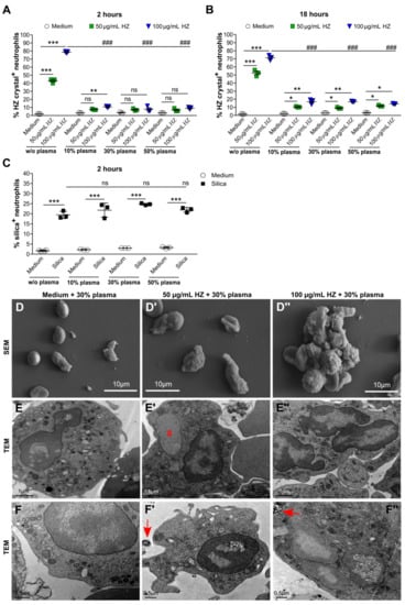 Recent studies reported that HZ crystals can interact with blood molecules such as proteins, lipids, and DNA in malaria [,]. However, the effect of protein-coated HZ on the ability of neutrophils to internalize these crystals is currently not known. Indeed, ex vivo cell culture experiments with medium might produce artificial results because the uptake of HZ in malaria occurs at a plasma concentration of around 50%. To investigate this, we cultured neutrophils with or without increasing amounts of human plasma from healthy individuals in the presence or absence of HZ for 2 and 18 h. Flow cytometric analysis revealed that neutrophils cultured without plasma (w/o plasma) took up large amounts of HZ after 2 h, whereas in the presence of human plasma (10–50%) the ability of neutrophils to recognize and internalize HZ was significantly inhibited (Figure 3A), even upon exposure up to 18 h (Figure 3B). In contrast, human plasma had no effect on the capacity of neutrophils to take up silica particles of the same size (Figure 3C). Morphologically, the presence of human plasma did not change the appearance of neutrophils (Figure 2A and Figure 3D–F). Those few neutrophils that had taken up HZ in the presence of plasma were activated, as indicated by their rough membrane surface (Figure 3D’,D”), and occasionally showed nuclei enlargement and loss of nuclear heterochromatin (Figure 3E’, indicated by #). Taken together, the data indicated that plasma altered the ability of neutrophils to recognize HZ as a danger signal, a vital mechanism during host defense.