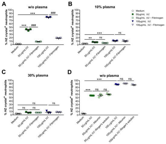 In malaria, a variety of serum/plasma proteins bind to HZ crystals such as serum amyloid A, gelsolin, fibrinogen, albumin, and the lipopolysaccharide (LPS)-binding protein []. Among these, fibrinogen levels have also been shown to increase in children with malaria infection []. To test whether fibrinogen can influence the uptake of HZ in neutrophils, we pre-incubated HZ with or without fibrinogen prior to stimulation with neutrophils. Flow cytometric analysis revealed that fibrinogen significantly diminished the percentage of HZ crystal+ neutrophils compared to HZ-treated neutrophils only under the plasma-free condition (Figure 4A). However, in the presence of 10% and 30% human plasma, fibrinogen had no additional effect on the uptake of HZ by after 2 h of stimulation (Figure 4B,C, respectively). Unlike fibrinogen, albumin and Ringer’s solution (negative control) did not affect HZ uptake under the plasma-free condition (Figure 4D), suggesting that fibrinogen coating of HZ crystals inhibits the ability of neutrophils to internalize these crystals.
