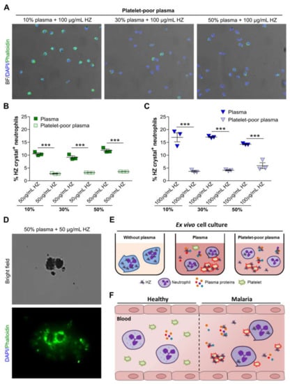 Human blood was drawn and standard dextran sedimentation performed to remove red blood cells. The top layer was removed and transferred into a 15 mL FALCON tube prior to centrifugation at 1500 g for 15 min. Using a new transfer pipette, the top layer was transferred into a new 15 mL FALCON tube and centrifuged at 1500 g for 15 min. After centrifugation, the top ¾ of plasma was removed using a transfer pipette and transferred into a new 15 mL FALCON tube. Isolated human blood neutrophils were then cultured in the presence or absence of synthetic HZ (50 and 100 µg/mL) in RPMI medium with or without 10%, 30%, or 50% human platelet-poor plasma for 2 h. After stimulation, neutrophils were either stained for fluorescence microscopy or harvested for flow cytometry to determine the percentage of HZ crystal+ neutrophils.
