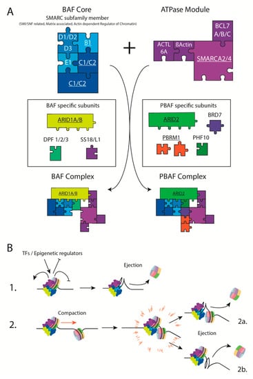 The identification of SWI/SNF subunits was a case of ultimate serendipity. Subunits were identified in two independent genetic screens in Saccharomyces cerevisiae. The first aimed to identify signal transduction molecules needed for the response to mating factors that lead to mating-type switching (SWI). The other screen was designed to identify signaling molecules leading to sucrose fermentation in response to nutrient switching in yeast (SNF; sucrose nonfermenting) [4,5]. The SWI/SNF components are related to the Trithorax family (TrxG), found in flies, to antagonize the polycomb group (PcG) proteins, in order to regulate Hox genes precisely [6]. The coevolution of the PcG and TrxG was accompanied by an increase in complexity. Mammalian PcG complex components are now separated into 3 complexes: the polycomb repressive complex 1 and 2 (PRC1/2) and the polycomb repressive deubiquitinase complex (PR-DUB). As for mammalian TrxG complex components, they are separated into the SWI/SNF and the COMPASS family. Mammalian SWI/SNF multiprotein complexes (Figure 1A) are now well described and appear, like PcG complexes, highly modular. BAF and PBAF SWI/SNF complexes are composed of 10 to 15 subunits, some of which are specific to the BAF (ARID1A/B; SS18/L1; DPF 1/2/3) or the PBAF (ARID2; BRD7; PBRM1; PHF10) complex. Shared subunits constitute the BAF core, composed of the SMARC subfamily members, and an ATPase module, containing the ATPase subunit BRM or BRG1 (SMARCA2 and SMARCA4 respectively). The precise mechanisms by which SWI/SNF complexes regulate gene expression are various and poorly understood. Early observations indicated that SWI/SNF complexes are capable of ATP-dependent nucleosome displacement and ejection which can be inhibited by histone mutants (Figure 1B) [7,8]. A recent study suggests different models by which the BAF complex can induce nucleosome ejection by itself and/or as a result of topological constraints [9]. Independently of nucleosome remodeling properties, SWI/SNF complexes could act as docking/recruitment platforms for epigenetic regulators as they have been shown to work alongside histone acetyltransferases (HATs) [10,11]. SWI/SNF complexes also notably appear to either antagonize polycomb-mediated repression or promote repression by polycomb in stem cells and cancer cells [3,12,13]. A study describing the role of the ATPase subunit in the composition and function of BAF and PBAF recently shed light on the regulation of those complexes. Pan et al. found that a residual BAF and PBAF complex can bind chromatin at overlapping sites in the absence of the ATPase subunit [14]. In this case, BAF and PBAF divergent localization on DNA was restored upon rescue of the ATPase subunit. Furthermore, a subset of binding sites are independent of the ATPase activity, supporting the idea that SWI/SNF functions are not necessarily linked to nucleosome remodeling. Moreover, this study supports the fact that the incorporation of specific subunits is potentially responsible for the SWI/SNF targeting.