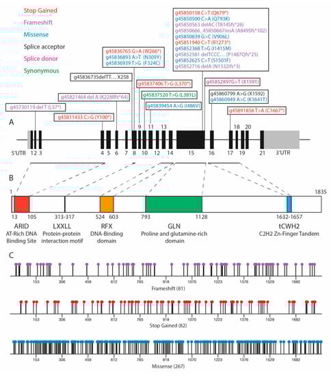 ARID2 gene and protein, with gene mutations found in cancer. (A) ARID2 gene structure along with mutations found in human hepatocellular carcinoma (HCC). (B) ARID2 protein structure with known domains. (C) Positions and nature of ARID2 mutations found in cancer (pan-cancer, The Cancer Genome Atlas (TCGA) data).