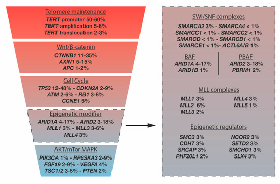 HCC is an example of cancer that frequently harbors ARID2 mutations. HCC is the most frequent primary liver cancer for which patients are often diagnosed at advanced stages and only unsatisfactory treatment options are available. Although early-stage tumors can be cured using surgical approaches, less than 30–40% of HCC patients are eligible for such curative therapeutic options. For patients with unresectable HCC, multikinase inhibitors (TKI) such as sorafenib and lenvatinib are used to limit disease progression. A protocol has recently emerged combining TKI treatments with immunotherapies to better improve patient survival, giving hope to patients [45]. HCC is a highly heterogeneous cancer, frequently occurring in a context of cirrhosis, and related to etiologies including viral hepatitis C and B (HCV and HBV), alcohol intake, and non-alcoholic steatohepatitis [46]. Moreover, HCC development relies on a complex multistep process involving different genetic alterations and deregulated signaling pathways [46]. Recent high-throughput genomic analyses have converged on mutational hotspots in human HCC confirming telomerase expression, β-catenin signaling, TP53 related signaling, and chromatin modifications among the core deregulated pathways in HCC initiation and/or progression [47,48,49,50] (Figure 3).