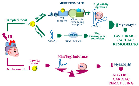 While the antithetical regulation of Myh6 and Myh7 gene expression by T3 via its nuclear receptors has long been recognized, so far the role of the cardiac Mhrt/Brg1 axis in the T3-dependent modulation of the Myh6/Myh7 expression ratio has never been investigated. To bridge this gap, in the present study we have exploited both in vivo and in vitro animal models and characterized a new T3-dependent cardioprotective mechanism that controls MHC isoform composition and relies on the cross-talk between Mhrt, Brg1, miR-208a, and chromatin remodeling.