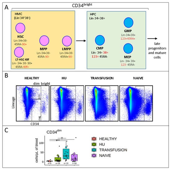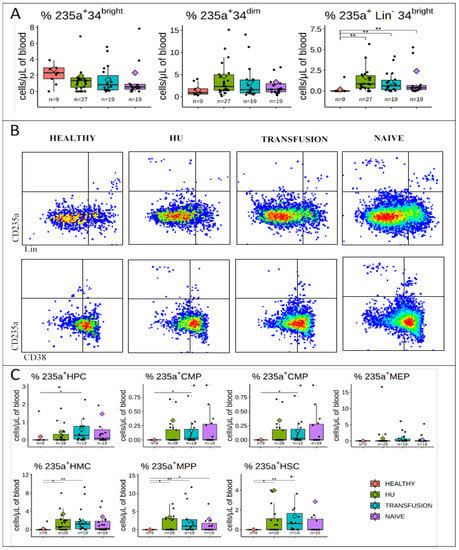 - Luck, L.; Zeng, L.; Hiti, A.L.; Weinberg, K.I.; Malik, P. Human CD34+ and CD34+CD38− hematopoietic progenitors in sickle cell disease differ phenotypically and functionally from normal and suggest distinct subpopulations that generate F cells. Exp. Hematol. 2004, 32, 483–493. [Google Scholar] [CrossRef]