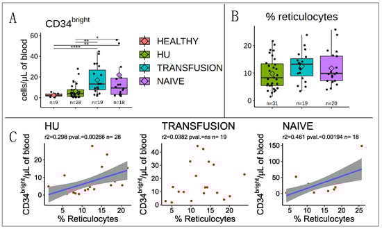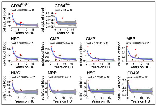 3.7. Number of Circulating HSPCs Decreases as a Function of the Duration of HU Treatment