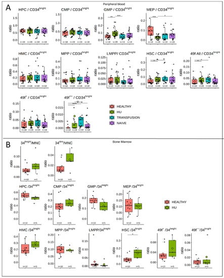 - Leonard, A.; Bonifacino, A.; Dominical, V.M.; Luo, M.; Haro-Mora, J.J.; Demirci, S.; Uchida, N.; Pierciey, F.J.; Tisdale, J.F.; Haro-Mora, J.J.; et al. Bone marrow characterization in sickle cell disease: Inflammation and stress erythropoiesis lead to suboptimal CD34 recovery. Br. J. Haematol. 2019, 186, 286–299. [Google Scholar] [CrossRef] [PubMed]