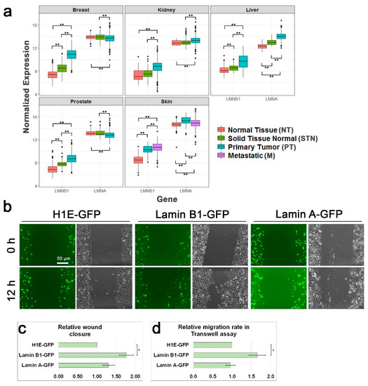 Lamin B1 has been found to be important for cell migration of several cell types [12,13,15,17]. Enhanced migration rate is one of the cancer hallmarks [42], therefore, we compared lamin B1 and lamin A expression levels between normal cells and tumor cells as well as between primary tumors and their metastases using GTEx (for normal tissues) and TCGA datasets. As shown in Figure 1a, lamin B1 RNA levels are significantly higher in various types of cancer including breast, kidney, liver, prostate, and skin. In addition, in skin cancer samples, lamin B1 RNA levels are higher in metastatic tumor samples than in primary tumor samples. On the contrary, lamin A RNA levels are upregulated in some types of cancer while down-regulated in others. To evaluate the effects of lamin B1 and lamin A on the migration rate of melanoma cells, we over-expressed these two genes in B16–F10 cells and measured the cellular migration rate. As a control, we used B16–F10 cells over-expressing histone H1E, which we previously found to not affect cell migration rate [40]. As expected, migration rate of lamin B1 over-expressing cells was increased by more than 50% in comparison to control cells over-expressing histone H1E in both the wound healing assay and the Transwell assay. On the other hand, lamin A over-expression did not change the cellular migration rate in a significant manner (Figure 1b–d), although the over-expression of lamin A was to a higher extent than the over-expression of lamin B1 (Figure S1).
