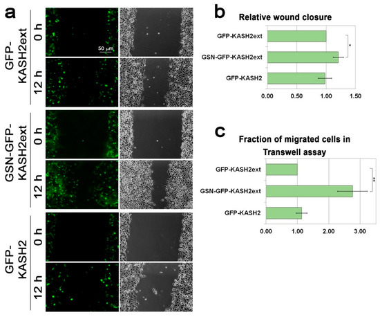 Next, we evaluated the effect of GSN-GFP-KASH2 on cell migration rate. Significantly, in the wound healing assay, GSN-GFP-KASH2ext expressing cells migrated 1.2-fold faster than GFP-KASH2ext expressing cells, while interference with the LINC complex by expression of GFP-KASH2 did not affect the migration rate of the cells (Figure 5a,b). The positive effect of GSN-GFP-KASH2ext expression on cell migration rate was increased to 2.7-fold once the migration rate was evaluated by the Transwell assay that requires bigger changes in nuclear morphology than the wound healing assay (Figure 5c). Interestingly, even in this migration assay, expression of GFP-KASH2 did not affect the migration rate of the cells, suggesting that migration of mouse melanoma cells is LINC complex-independent. On the contrary, migration of these cells was accelerated by interfering directly with the perinuclear actin rim (Figure 5) as well as by over-expression of Lamin B1 (Figure 1) that interfered with the perinuclear actin rim (Figure 3). Overall, our results support a model in which increased lamin B1 levels can accelerate the cellular migration rate by interfering with perinuclear actin rim formation.