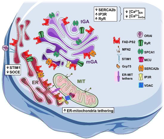 Similarly, by using newly developed genetically encoded Ca2+ indicators, the Förster resonance energy transfer (FRET)-based probe targeted to ER (D4ER [46]), medial-GA [47], and trans-GA [48], we showed that (i) in SH-SY5Y and Baby Hamster Kidney (BHK) cells, expressing the FAD-PS2-T122R mutant, and in PS2-N141I patient-derived fibroblasts, there is a clear reduction in ER Ca2+ concentration; (ii) in cells expressing the FAD-PS1-A246E mutant, instead, no change was observed [46,49]; (iii) the expression of FAD-PS2 mutants induced a selective decrease in the medial-GA Ca2+ content, but not in that of the trans-GA; (iv) in contrast, the expression of the FAD-PS1 mutant was ineffective on both GA sub-compartments [49] (Figure 1).