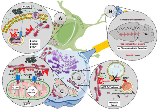 Functional consequences of dysregulated Ca2+ signalling induced by FAD-PS2. The cartoon represents the major dysfunctions linked to the expression of FAD-PS2 mutants at both the cellular and brain network levels. (A) Decreased store-operated Ca2+ entry (SOCE) potentiates amyloid precursor protein (APP) processing and Aβ42 production. (B) FAD-PS2-N141I-based mice show altered neuronal circuits (decreased phase-amplitude coupling between cortical slow oscillations and hippocampal fast gamma frequencies). (C) Decreased mitochondrial Ca2+ signalling and pyruvate uptake impair mitochondrial metabolism and cell bioenergetics. (D) Reduced endoplasmic reticulum (ER) Ca2+ release blocks the recruitment to autophagosomes of the Ras-associated binding protein RAB7 and their subsequent fusion with lysosomes. See text for details.