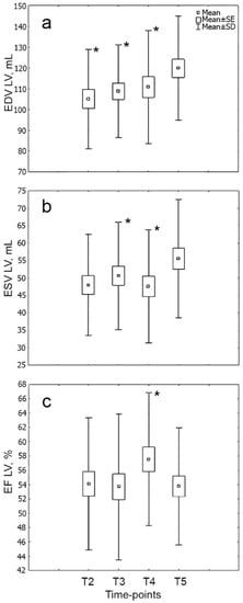 Dynamics of the main echocardiographic parameters ((a) EDV, (b) ESV, (c) EF) of LV in the six-month period in patients with STEMI (n = 31). Note: * p < 0.05: significant difference between time point T5 and other time points. EDV—end-diastolic volume, ESV—end-systolic volume, LV—left ventricle, EF—ejection fraction; T2—3rd day; T3—7th day; T4—14th day; T5—6 months after MI [].