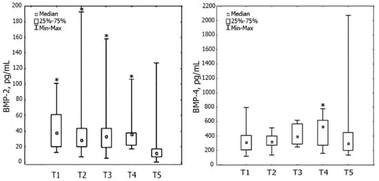 Dynamics of serum levels of BMP-2 and BMP-4 (n = 31) in the six-month period in patients with STEMI. Note: * p < 0.05: significant difference between time point T5 and other time points. BMP—bone morphogenetic protein; T1—1st day; T2—3rd day; T3—7th day; T4—14th day; T5—6 months after MI.