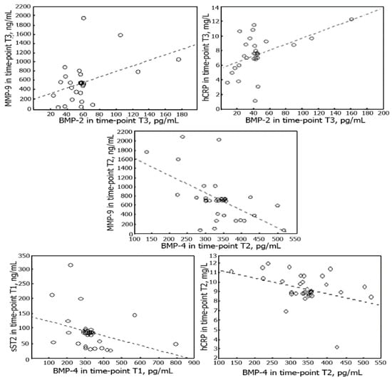 Serum level of BMP-2 correlated with the serum levels of hCRP and MMP-9 measured at time-point T3. The serum level of BMP-4 correlated with the serum level of sST2 measured at time-point T1; at time-point T2 it correlated with the levels of MMP-9 and hCRP. There were no correlations between the serum levels of NT-proBNP and BMPs. All correlations are shown in Figure 3. The correlation was also observed between serum levels of BMP-2 and BMP-4 at time-point T5 (r = 0.6, p = 0.03).