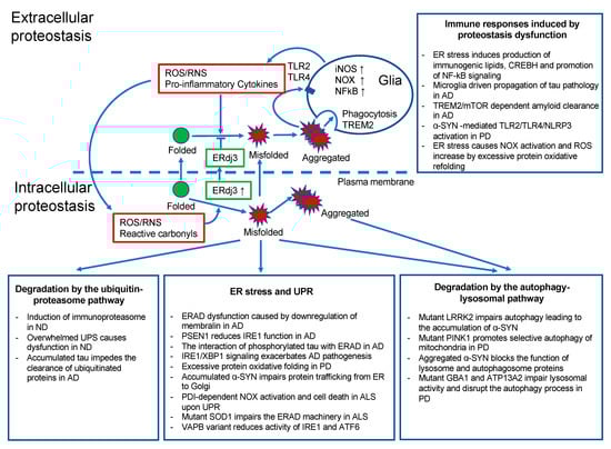 Recent research indicates a profound interplay between the ER and oxidative stress, which is mediated by ROS and derived reactive carbonyls, converging at the redox imbalance between a reducing environment in the cytosol and an oxidative ER, respectively [33,34]. ER stress may be both a trigger and a consequence of chronic inflammation. Chronic inflammation is often associated with diseases that arise because of primary misfolding mutations and ER stress. Similarly, ER stress and activation of the UPR are features of many chronic inflammatory and autoimmune diseases [35,36,37]. Next, we describe how dysregulation in the ER, UPS, and autophagy leads to proteostatic deficit in neurodegenerative diseases.