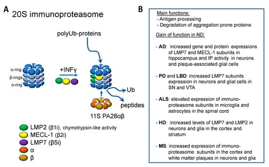 Immunoproteosome and its function in neurodegenerative diseases. (A) Immunoproteosome is formed from the constitutive proteosome upon inflammatory stimuli by the incorporation of specific β subunits and the co-production of proteosomal activator 11S PA28αβ. (B) Evidence for the increased function of immunoproteosome in neurodegenerative diseases.