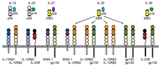 Cytokines are important mediators of the immune system. They are involved in pathophysiological processes including autoimmunity and cancer development. In contrast to hormones, cytokines are produced by more than one cell type. Most cytokines act locally in an autocrine or paracrine fashion. Exceptions are cytokines, which enter the bloodstream and signal endocrine, or membrane-bound cytokines, which act juxtacrine. Cytokines are classified according to their function or structure, or based on the receptors they bind. The latter is a reasonable classification because cytokines bind to multimeric receptor complexes in which often one subunit is also found in receptor complexes utilized by other cytokines [1,2]. Accordingly, cytokines and cytokine receptors are subdivided into seven major families [3]. The largest family are class I cytokine receptors and corresponding cytokines. A central feature of class I cytokines is a common up-up-down-down topology of their four antiparallel α helices. Therefore, these cytokines have also been referred to as the α-helical bundle cytokine family [4]. Class I cytokines are further subdivided based on the shared receptor subunit [3]. One group are IL-6 family cytokines, which are defined as cytokines that use the common signaling receptor subunit gp130 and originally comprise eight cytokines—IL-6, IL-11, IL-27, oncostatin M (OSM), leukemia inhibitory factor (LIF), ciliary neurotrophic factor (CNTF), cardiotrophin 1 (CT-1), and cardiotrophin-like cytokine factor 1 (CLCF1) [2]. IL-35, and IL-39 have been recently added to the family because they share gp130 in their receptor complexes [5]. A second group of class I cytokines are IL-12 family cytokines. Members of the IL-12 family form soluble heterodimers consisting of a four-helix-bundle α subunit (IL-23p19, IL-27p28 or IL-12p35) and a β subunit (Epstein–Barr virus-induced gene 3, EBI3 or IL-12p40), which is structurally related to soluble IL-6 receptor alpha (sIL-6Rα) [6]. At the moment, the IL-12 cytokine family has five members—IL-12, IL-23, IL-27, IL-35 and IL-39 (Table 1, Figure 1). IL-27, IL-35 and IL-39 are shared with the IL-6 family. A possible sixth member, called IL-Y, has currently only been described as a genetically engineered heterodimer IL-27p28/IL-12p40 [7,8].