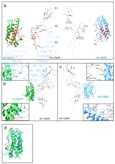 IL-12 cytokines function as heterodimers comprising two subunits, α and β (Table 1). Similarly to members of the IL-6 family, the α subunits IL-12p35 and IL-23p19 of IL-12 and IL-23 contact their shared β subunit IL-12p40 through residues located in helices A and D and the AB loop connecting helices A and B. The corresponding residues of IL-12p40 are located in domains D2 and D3. The β subunits are linked to the α subunits through disulfide bonds formed between C96 of IL-12p35 and C73 of IL-23p19 and C199 of the IL-12p40 subunit for human IL-12 and IL-23, respectively (Figure 2). Amino acids are numbered according to the database entry starting with the signal peptide. However, IL-27 and IL-35 are not secreted as disulfide-linked heterodimers [49]. IL-23 is a composite cytokine consisting of IL-23p19 and IL-12p40, whereas IL-12 is formed by IL-12p35 and IL-12p40 [11,13,50]. The latter was independently identified by two groups and named natural killer cell stimulatory factor (NKSF) and cytotoxic lymphocyte maturation factor (CLMF), respectively [10,12]. Secretion of bioactive IL-12 requires co-expression and disulfide bond formation of IL-12p35 and IL-12p40 in the cell [11,13,51]. IL-12p40 is found as free monomer or disulfide-linked homodimer and promotes stabilization and export of IL-12p35 [52,53]. IL-12p35 alone could not be detected [54]. Co-expression of its β subunit IL-12p40 inhibits IL-12p35 misfolding and allows secretion of biologically active heterodimeric IL-12 [55]. The intermolecular disulfide bridge is dispensable for formation and activity of IL-12 [51,56]. However, decreased IL-12 stability and secretion was reported in the absence of the inter-chain disulfide bond [57]. Nevertheless, one disulfide bond within IL-12p35 is critical for IL-12 secretion, stability and biological activity [55]. The disulfide-linked homodimer (IL-12p80) is secreted in excess compared to IL-12 [58]. Secreted IL-12p40 monomer and homodimers function as IL-12 antagonists [59,60]. IL-12p40 homodimers induced preventive and therapeutic effects in autoimmune arthritis models [61]. Secreted IL-12p40 also impaired IL-23-mediated responses [62]. However, a few studies reported IL-12p40 homodimer as an agonist in macrophage chemotaxis [63,64], an inducer of TNF and LTα in microglia and macrophages [65,66], and of iNOS in microglia [67].