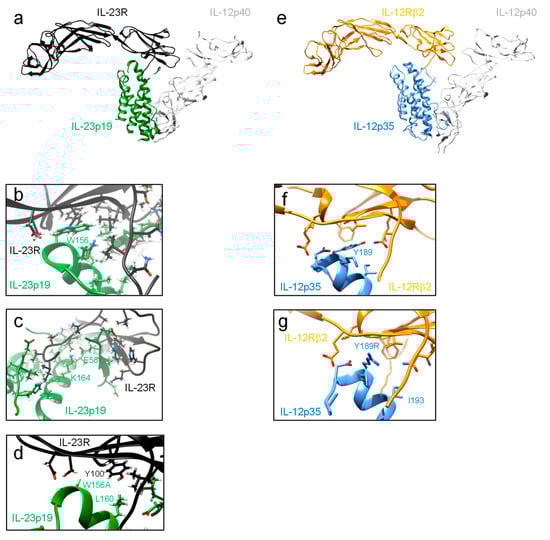 - Schroder, J.; Moll, J.M.; Baran, P.; Grotzinger, J.; Scheller, J.; Floss, D.M. Non-canonical interleukin 23 receptor complex assembly: p40 protein recruits interleukin 12 receptor beta1 via site II and induces p19/interleukin 23 receptor interaction via site III. J. Biol. Chem. 2015, 290, 359–370. [Google Scholar] [CrossRef]