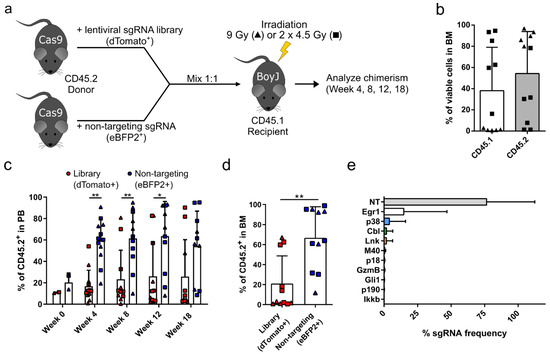 Figure 1. Targeted sgRNA screen identified potential candidate genes that mediate a competitive advantage during bone marrow transplantation. (a) Scheme of competitive bone marrow transplantation. Donor cells were derived from CD45.2+ Cas9 mice and were transduced with a lentiviral sgRNA library and a dTomato fluorescent reporter. CD45.2+ Cas9 competitor cells were transduced with a nontargeting sgRNA and eBFP2 fluorescent reporter. Donor cells were mixed 1:1 and transplanted into irradiated CD45.1+ recipient mice. Recipient mice were irradiated with either a single dose of 9 Gy (triangles) or a fractionated dose of 2 × 4.5 Gy (squares). Peripheral blood of the transplanted mice was analyzed on weeks 4, 8, and 12 after transplantation. Final analysis was performed 18 weeks after transplantation. (b) Donor cell chimerism was analyzed in the bone marrow 18 weeks after transplantation. (c) The presence of dTomato+ cells (red) carrying the sgRNA library and eBFP2+ competitor cells (blue) was monitored over time in peripheral blood. (d) The frequency of dTomato+ cells carrying the sgRNA library and eBFP2+ competitor cells was analyzed in the bone marrow on week 18 after transplantation. (e) The sgRNA frequency of each candidate gene in the library was assessed via next-generation sequencing in bone marrow samples of recipient mice 18 weeks after transplantation. NT = nontargeting. Statistics: n = 11, mean ± SD, two independent experiments, t-test (b,d), two-way ANOVA comparing row means only (c), * p < 0.05, ** p < 0.01.
