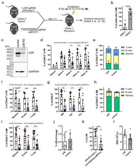 Figure 2. CRISPR-Cas9-mediated knockout of p38 increases the repopulating capacity of hematopoietic stem and progenitor cells (HSPCs). (a) Schemata of the competitive bone marrow transplantation. Using lentiviral vectors, p38 was knocked out in CD45.2+ HSPCs from Cas9 mice (labeled with a dTomato fluorescent reporter) and transplanted into irradiated CD45.1 mice. As competitors, HSPCs were transduced with a nontargeting sgRNA and an eBFP2 fluorescent reporter. Mice were irradiated with either a single dose of 9 Gy (triangles) or a fractionated dose of 2 × 4.5 Gy (squares). Peripheral blood was analyzed 4, 8, and 12 weeks after transplantation. On week 18, the animals were euthanized for final analysis. (b) The donor cell chimerism was analyzed as CD45.1+ and CD45.2+ cells in the bone marrow 18 weeks after transplantation. (c) The knockout of p38 was verified by Western blot analysis of a representative bone marrow sample. GAPDH was used as loading control. KO = knockout. (d) The frequency of p38 knockout HSPCs (red) and competitor cells (blue) was monitored over time in the peripheral blood of transplanted animals. (e) The lineage distribution for myeloid (CD11b+), B (B220+), and T (CD3+) cells was assessed in the peripheral blood of transplanted animals 18 weeks after transplantation in comparison to age-matched control animals. (f) The frequency of dTomato+ p38 knockout cells (red) and eBFP2+ competitor cells (blue) was measured in myeloid, B, and T cells in the peripheral blood on week 18 after transplantation. (g) Bone marrow (BM), spleen (Spl), and thymus (Thy) were analyzed for the presence of p38 knockout cells (red) and competitor cells (blue) 18 weeks after transplantation. (h) The lineage distribution in the bone marrow was analyzed 18 weeks after transplantation by measuring CD11b+ myeloid cells, B220+ B cells, and CD3+ T cells. (i) The presence of dTomato+ p38 knockout cells and eBFP2+ competitor cells were assessed in myeloid, B, and T cells in the bone marrow of transplanted animals on week 18 post-transplantation. (j) The frequency of Sca1+ c-Kit+ Lineage- (LSK) cells was measured in the bone marrow 18 weeks after transplantation. Circles refer to untransplanted age-matched control animals. (k) On week 18 post-transplantation, the frequency of dTomato+ p38 knockout cells (red) and eBFP2+ competitor cells (blue) were analyzed in LSK cells in the bone marrow of transplanted mice. (l) The white blood cell count (WBC) was quantified in the peripheral blood in mice transplanted with p38 knockout cells on week 18 after transplantation and compared to age-matched, untransplanted control animals (circles). Statistics: n = 11, mean ± SD, two independent experiments, t-test (b,jl), two-way ANOVA comparing row means (d,f,g,i) or column means only (e,h), * p < 0.05, ** p < 0.01, *** p < 0.001, **** p < 0.0001.