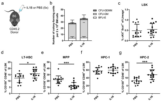 Figure 3. Challenging donor mice with IL1B leads to activation of LT-HSCs and mimics X-CGD disease pathology. (a) CD45.2+ donor mice were injected five times in a 2-day interval with IL1B or PBS as control. (b) Colony-forming assay was performed on bone marrow samples of IL1B- or PBS-treated donor mice. CFU = colony-forming unit, GEMM = granulocytic, erythroid, monocyte-macrophage, and megakaryocyte, GM = granulocyte/monocyte-macrophage, BFU = burst-forming unit, E = erythroid. Statistics: n = 4, mean ± SD, two-way ANOVA comparing row column means only, ** p < 0.01. (cg) The frequency of (c) Sca1+ c-Kit+ Lineage- cells (LSK), (d) CD150+ CD48- long-term (LT-) HSCs, (e) CD150- CD48- multipotent progenitors (MPP), (f) CD150- CD48+ hematopoietic progenitors type 1 (HPC-1), and (g) CD150+ CD48+ hematopoietic progenitors type 2 (HPC-2) was measured in the bone marrow of IL1B- and PBS-challenged mice. Statistics: n = 14, mean ± SD, four independent experiments, t-test, * p < 0.05, ** p < 0.01, *** p < 0.001.