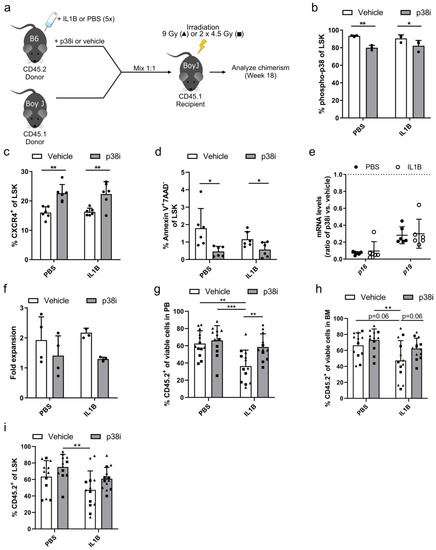 Figure 4. Inhibition of p38 MAPK improves the engraftment of IL1B-challenged HSPCs. (a) Schemata of competitive bone marrow transplantation after IL1B challenge. HSPCs derived from IL1B-challenged or PBS-control CD45.2+ donor mice were cultured for 2.5 days in the presence of a p38 small molecule inhibitor (p38i) or DMSO as vehicle control. Untreated CD45.1+ HSPCs were used as competitors. Donor cells were mixed in a 1:1 ratio and transplanted into irradiated CD45.1+ recipient mice. Recipients were irradiated either with a single dose of 9 Gy (triangles) or a fractionated dose of 2 × 4.5 Gy (squares). The animals were analyzed on week 18 after transplantation. (b) Intracellular staining was performed to detect phospho-p38 levels in IL1B-challenged or PBS-control LSK cells after cultivation of HSPCs with p38i or vehicle control. (c) Prior to transplantation, expression of the HSC homing factor CXCR4 was analyzed in LSK cells derived from IL1B-challenged or PBS-control donor mice after cultivation with p38i or DMSO as vehicle control. (d) Apoptotic cells were assessed in LSK cells treated with p38i or DMSO as vehicle control by staining for Annexin V+ and 7AAD- cells. (e) Quantitative RT-PCR was performed to detect p16 and p19 mRNA levels in HSPCs treated with p38i in relation to vehicle-treated HSPCs. Expression levels were normalized to β-Actin levels. The dotted line at 1.0 indicates the level of normalization (no up- or downregulation). (f) The cell expansion during cultivation of IL1B-challenged or PBS-control HSPCs was quantified by comparing the cell count before and after treatment with p38i or DMSO as vehicle control. (g) The frequency of CD45.2+ donor cells was analyzed in the peripheral blood of animals 18 weeks after transplantation of p38i-treated or vehicle control HSPCs. (h) The CD45.2+ donor cell engraftment was measured in bone marrow samples of transplanted animals 18 weeks after transplantation of p38i-treated or vehicle control HSPCs. (i) The frequency of CD45.2+ donor cells was assessed in LSK cells on week 18 after transplantation in the bone marrow of mice transplanted with p38i-treated or DMSO-treated vehicle control HSPCs. Statistics: in vitro experiments (bf): n = 3–6, mean ± SD, two-way ANOVA comparing row means only (b,c,f) or multiple t-test correcting for multiple comparisons using the Holm–Sidak method (d), in vivo experiments (gi): n = 13, four independent experiments, mean ± SD, two-way ANOVA, * p < 0.05, ** p < 0.01, *** p < 0.001.