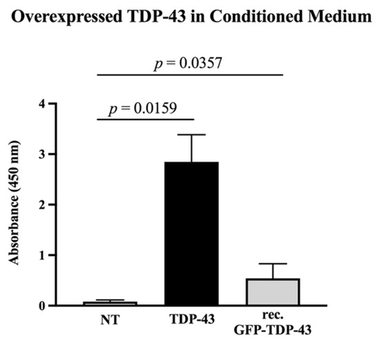While utilizing an HEK293T cell line overexpressing wtTDP43-6×His (from now on, referred to simply as TDP-43), we observed that overexpressed TDP-43 had been released into the culture medium (p = 0.0159) within 72 h post-transfection (Figure 2). The specificity of the sandwich ELISA method employed (Figure 1b) for the detection of overexpressed TDP-43 was validated by the low background absorbance when applying medium from non-transfected cells (Figure 2, white bar) and by the positive absorbance upon applying 1.0 µg/mL of purified GFP-wtTDP43-6×His (p = 0.0357) as a positive control (Figure 2, grey bar).