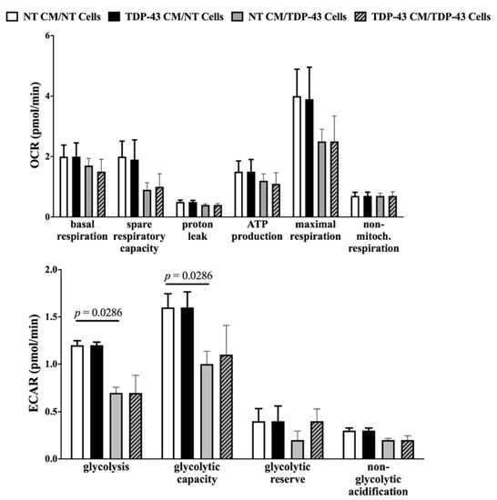 To assess an effect of TDP-43-conditioned medium on the energy metabolism of cells, the rates of oxidative phosphorylation (oxygen consumption rate (OCR)) and glycolysis (extracellular acidification rate (ECAR)) were measured. Across all metabolic parameters, TDP-43-conditioned medium did not appear to perturb energy metabolism (Figure 3). Neither did TDP-43 overexpression in NT CM/TDP-43 cells seem to affect energy metabolism, apart from diminished glycolytic rate and capacity (p = 0.0286). Therefore, these data suggest that neither TDP-43 overexpression nor TDP-43-conditioned medium caused severe alterations in energy metabolism.
