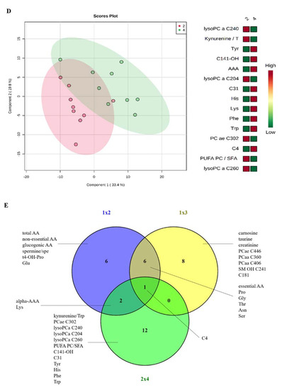 For metabolomics analysis, two separate analytical methods were employed to identify discriminant metabolites—multivariate and univariate analyses. These analyses were performed using MetaboAnalyst v4.0 (http://www.metaboanalyst.ca). The classification method was based on partial least squares discriminant analysis (PLS-DA). Values of variable importance in projection [20] represent the importance of the metabolite for the PLS-DA models. The score scatter plots show the classified samples, and the loading plot characterizes the relation between the Y and X variables. For each analysis, the standard, default parameters of MetaboAnalyst were applied. The univariate analysis of metabolite levels was based on the fold-change (FC) values and the threshold of significance (p < 0.1) after a non-parametric Wilcoxon test (volcano plot), while the multivariate analysis of metabolites depended on the accuracy of the variable importance in the projection (VIP). Therefore, the metabolites that had VIP values > 1 of the multivariate analyses and those that were determined by an FC > 2 (for each comparison) with p < 0.1 of the univariate analyses were retained as the most relevant for further discussion [21,22].