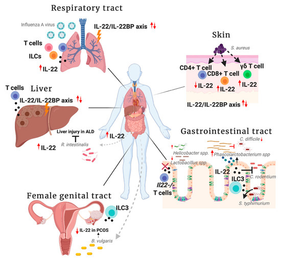 | Respiratory tract | Influenza A virus | ↑ IL-22 [104] | αβ T cells, γδ T cells and ILCs | |