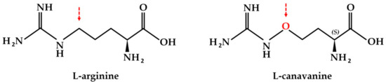 l-canavanine, a non-proteinogenic amino acid found in certain leguminous plants, is a naturally occurring structural analog of l-arginine. The sole structural difference between arginine and canavanine is the replacement of carbon with oxygen in the terminal methylene group (Figure 1) [26]. There are several reports that consider canavanine as a possible proteomimetic amino acid that could be incorporated instead of arginine into newly synthesized proteins [13,27]. Importantly, in the case of gliomas as targets, the effect of the combination of enzymatic arginine deprivation with canavanine does not depend on the permeability of the brain–blood barrier, as canavanine is transported by the same carriers as arginine, thus increasing the feasibility of a potential prospective therapy [27].