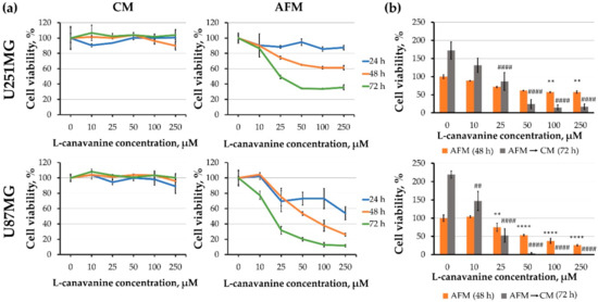 First, we addressed the question whether the effects of canavanine on two human glioblastoma cell lines, U251MG and U87MG, which are known to differ in their proliferation, migration and invasiveness [37]. It was observed that canavanine strongly inhibited the viability of both cell lines in concentration- and time-dependent manners specifically under arginine deprivation (Figure 2a).