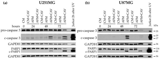 Although after 48 h of incubation in arginine-deficient medium, both cell lines could readily restore their proliferation when arginine was resupplemented. It was observed that preincubation with canavanine at concentrations above 50 µM essentially blocked such growth restoration (Figure 2b). Furthermore, the number of dead cells was noticeably increased after 48 h of treatment with 100 µM canavanine, which coincided with a progressive accumulation of the cleaved forms of PARP1 and caspase 3 after 48 h of treatment in both glioblastoma cell lines (Figure 3). Additionally, under canavanine co-treatment, a decreased level of the proapoptotic protein Bcl-2 was observed in U251MG cells (Figure S1). No significant differences in the level of the active cleaved form of caspase 9 in either cell line under all the examined conditions were detected (Figure S1).