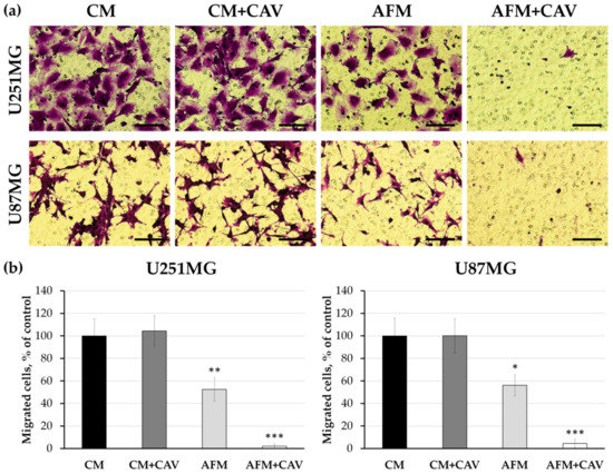 Cell migration was assayed using 24-well TranswellTM chambers with 6.5 mm-diameter polycarbonate filters with 8 μm-pore-size TranswellTM migration inserts according to the manufacturer’s instructions with the following modifications (Corning CLS3422-48EA, Glendale, AZ, USA). The assay was based on chemotactic directional migration. Cells were treated under experimental conditions for 48 h, as were the control cells. Then, the cells were trypsinized, washed twice with serum-free medium and counted. The same numbers of living cells were seeded (2.5−3 × 104 cells/well depending on the cell line) on the upper chamber and allowed to migrate through the filter to the lower chamber containing DMEM with 10% FBS. After 8–18 h (for U251MG and U87MG cells, respectively), the cells were fixed with 4% PFA for 15 min and stained with 0.5% crystal violet (Sigma-Aldrich) for 7–10 min. Cells that did not migrate through the filter were removed from the upper chamber by using a cotton swab. Migrated cells were photographed using a Nikon Eclipse Ti-U fluorescent microscope equipped with a 20× objective and DS-Qi2 digital camera and then counted with the Fiji distribution of the ImageJ 1.52a software (National Institutes of Health and the University of Wisconsin). The percentage of migrated cells was calculated by assuming 100% for the control conditions.