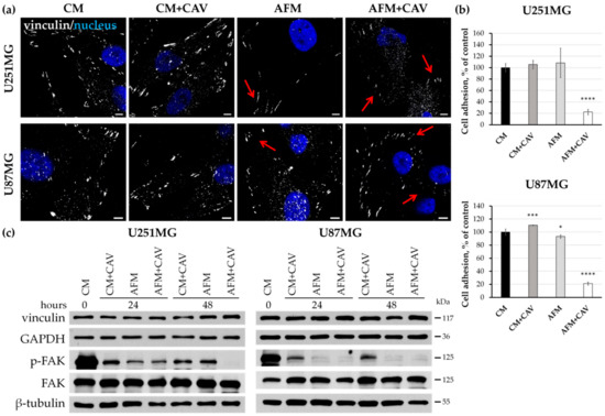 Effects of canavanine on adhesion of human glioblastoma cells. (a) Immunocytochemical staining for vinculin. Nuclei were labeled with DAPI. Cells were treated for 48 h under indicated experimental conditions under CM and AFM, with or without 50 µM canavanine. Bars, 10 µm. Arrows point to altered focal adhesion contacts. (b) Cancer cell adhesion to collagen I after the 48 h of treatment in CM and AFM with or without CAV. Graphs represent mean values ± SD from three independent experiments. * p < 0.05, *** p < 0.001, **** p < 0.0001 relative to CM (control, 100%). (c) Immunoblotting of proteins involved in cell adhesion and migration. GAPDH and β-tubulin were used as protein loading controls.