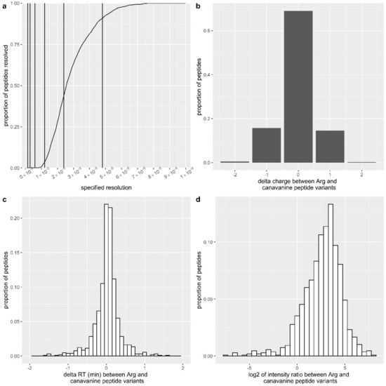 Calculations were performed essentially as described in [35] using the canavanine-containing peptides identified in this study. The atomic masses for 1H, 12C, 13C and 16O were taken as equal to 1.0078, 12, 13.0033 and 15.9949, respectively, from the CIAAW atomic weights of the elements (2019) [36]. The mass difference between the 3rd isotope of the unmodified peptide and 1st isotope of the canavanine-containing peptide is (13.0033–12) × 2 − (15.9949 − 12 − 1.0078 × 2) = 0.0273 or 27.3 mDa. The theoretical full width at 10% maximum (FWTM) peak height was computed for each identified peptide at the measured m/z and charge containing canavanine at 100 different resolutions (starting with 1 × 104 and incrementing by 1 × 104 until 1 × 106) using Equation (1).