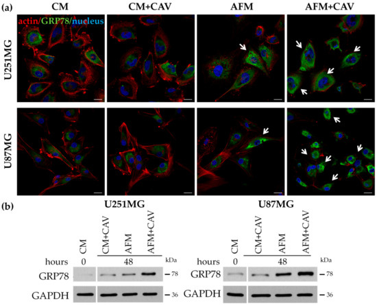 Since arginine deficiency has been shown to induce endoplasmic reticulum (ER) stress in many cancer cell lines [56] and our mass spec data showed a significant enrichment of GO terms related to the unfolded protein response, our next goal was to analyze the effect of canavanine on this process in human glioblastoma cells. We performed immunofluorescence staining for a marker of ER stress, namely, the ER chaperone 78-kDa glucose-regulated protein (GRP78) [57,58]. We noticed an accumulation of GRP78 within the ER of both analyzed glioblastoma cell lines after 48 h of incubation under arginine deprivation in the presence of canavanine (Figure 9a, see arrows). These observations were confirmed by Western Blot analysis, which showed a significant increase in the level of GRP78 in cell lysates (Figure 9b). On the other hand, canavanine co-treatment only slightly increased the level of GRP78 in primary rat glial cells under analogous conditions (Figure S9).