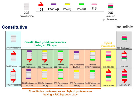 Types of Proteasomes. The constitutive proteasome is composed of the 20S CP and a single or double 19S cap to form the 26S or 30S proteasomes, respectively. When cells are exposed to inflammatory stimuli, i.e., TNF-α or IFN-γ, immunoproteasomes are assembled. The 20S CP incorporates βi-Ring, and is capped by PA28α/β, PA28γ, and PA200 caps on either one of both sides. Hybrid proteasomes have a 19S cap mixed with any of the activated caps (PA28α/β, PA28γ, and PA200). Hybrid iProteasome may be comprised of 11S, 20S, and 11S, or 19S cap, 20S, and 11S components. The inducible proteasome is composed of the 20S iProteasome and a single or double 19S cap to form the 19S-20S or 19S-20S-19S proteasomes, respectively.